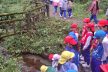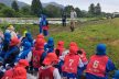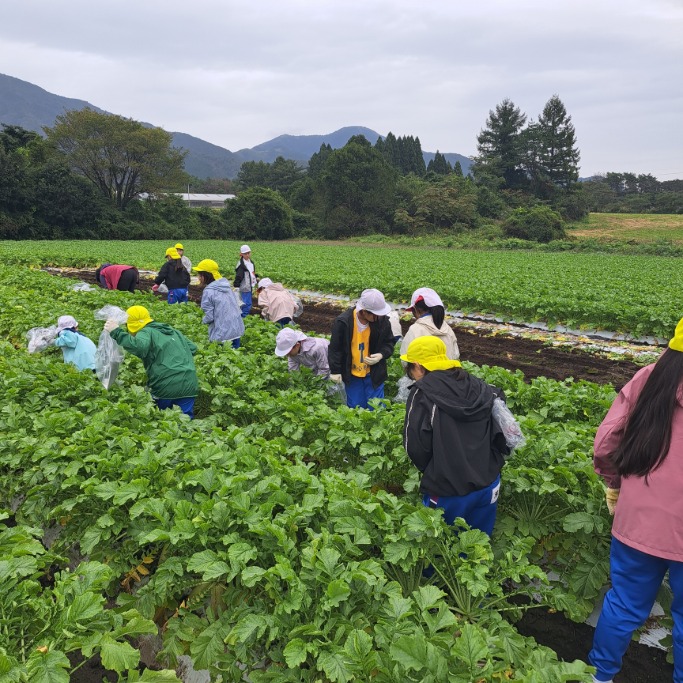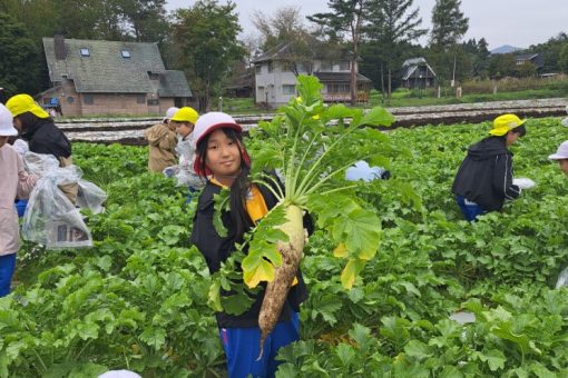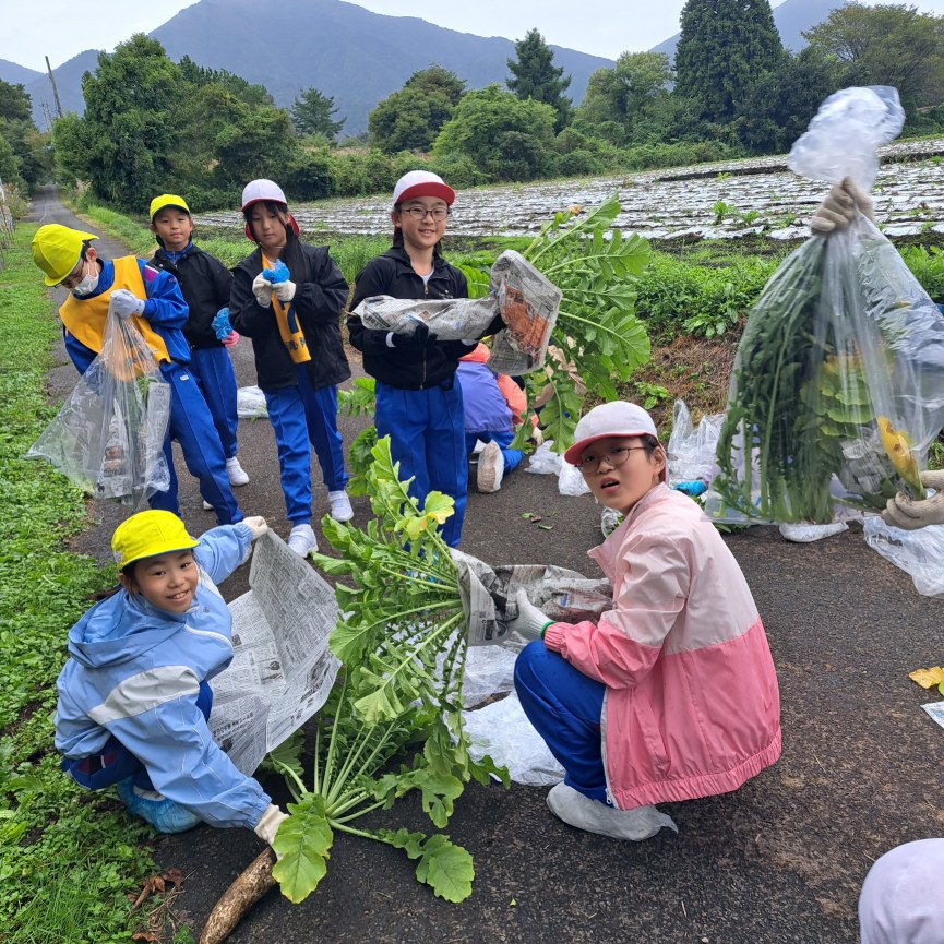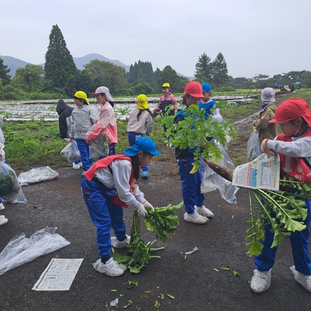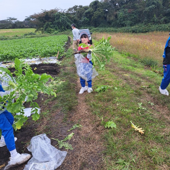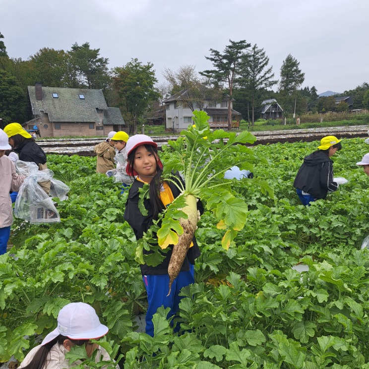 最後の活動「大根の収穫体験」が終わりました。今年は日照りで出来が今一つと聞いていましたが,立派な大根もあるようです。雨も降りだしたようです。帰路につきます。