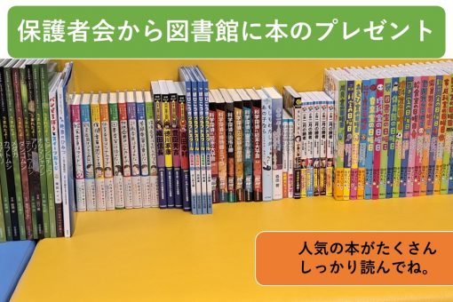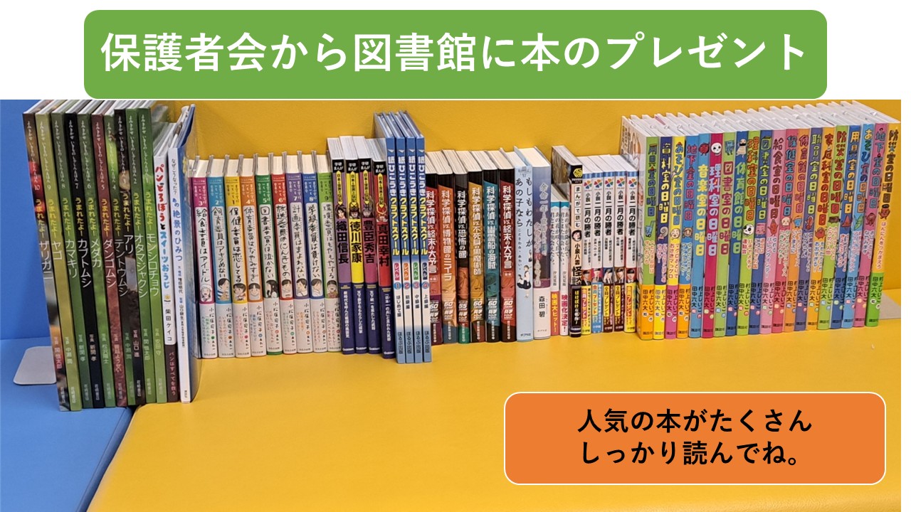 毎年保護者会から図書館に本を寄贈していただいています。今年もいただきました。人気の本がたくさん届きました。子ども達は大喜びです。本当にありがたいことです。保護者会の皆様ありがとうございました。