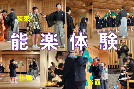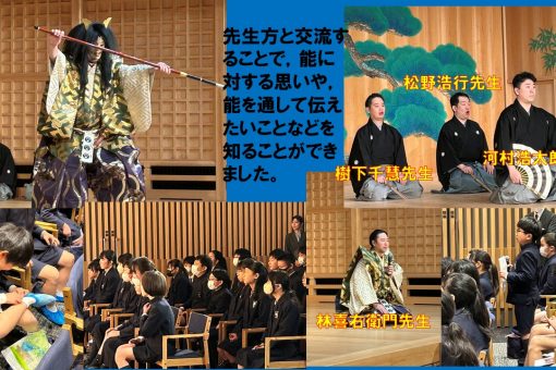 3月10日(火) 卒業を間近にひかえた6年生が能楽体験を行いました。十四世を襲名された林喜右衛門先生,松野浩行先生,河村浩太郎先生,樹下千慧先生に来ていただきいろいろな体験をしました。迫力ある「船弁慶」を目の前で鑑賞することもできました。先生方には,子ども達の質問に対して,丁寧に誠心誠意答えていただきました。子ども達は先生方の生き方や考え方に触れ,いつかきっと思い出して役に立つ日が来ることでしょう。毎年素晴らしい場所と時間を提供していただいているtenjin9能楽堂ホールの皆様にも感謝いたします。